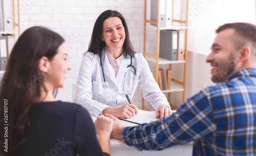 Fototapeta premium Cheerful doctor consulting young couple during appointment