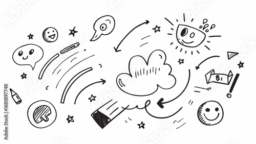 Fototapeta premium Cheerful doodles with sun and speech bubbles drawing