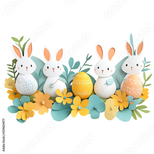 © Png Flora, Obraz premium Cheerful Easter Banner with Paper Bunnies, Eggs, and Flowers Isolated on Transparent Background