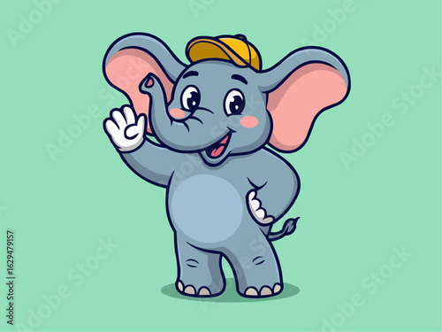 Fototapeta premium Cheerful Elephant Character with Hat Waving – Fun Animal Vector for Kids