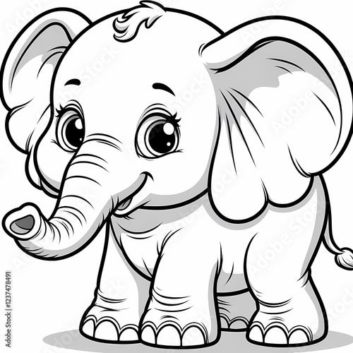 © Akram, Fototapeta premium Cheerful elephant with large floppy ears and long trunk in black-and-white line art