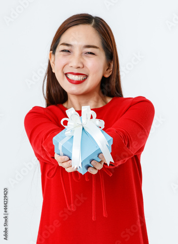 © Bangkok Click Studio, Fototapeta premium Cheerful ethnic woman with present in studio