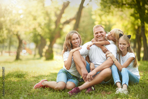 © Anton, Fototapeta premium Cheerful family sitting on the grass during a picnic in the park