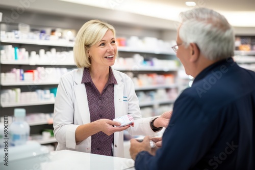 Obraz premium Cheerful female pharmacist engaging with senior customer in pharmacy,...