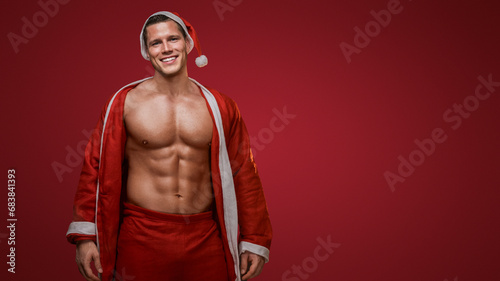© Fxquadro, Fototapeta premium Cheerful fitness Santa smiling with a jacket over his shoulder