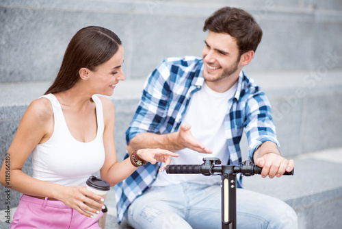 © zinkevych, Fototapeta premium Cheerful friends discussing scooter