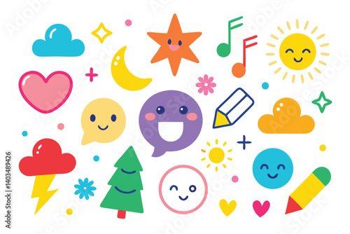 Obraz premium Cheerful Fun Elements Cartoon Clouds, Heart, Star, Sun, Notes, and Tree