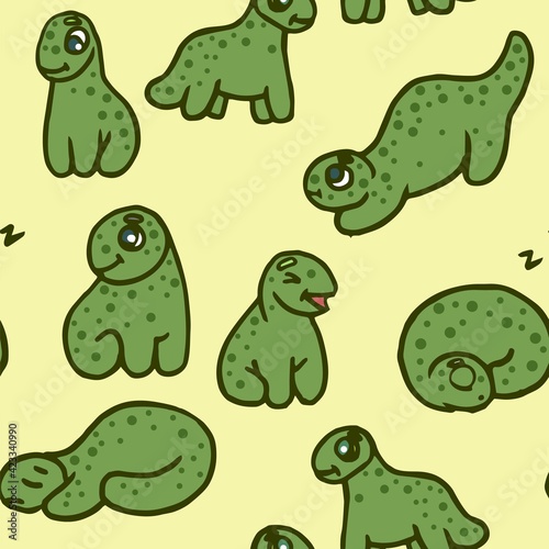 © Natalia, Obraz premium Cheerful funny dinosaur. Seamless dino illustration. Cartoon sketch style. Hand outline drawing of animal. vector
