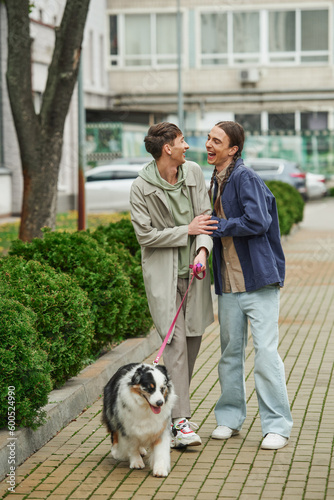 Obraz premium cheerful gay man in casual outfit holding leash of Australian shepherd dog while walking out together with excited boyfriend with pigtails near modern building and bushes on urban street