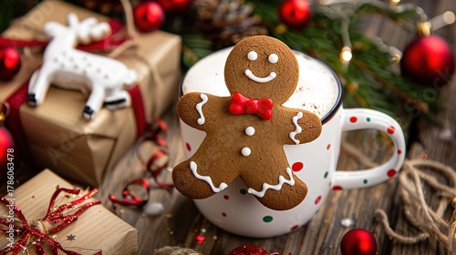 © QQH, Obraz premium Cheerful Gingerbread Man in Festive Hot Beverage for Christmas