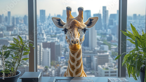© THUA, Obraz premium Cheerful giraffe in modern city office with stunning skyline view