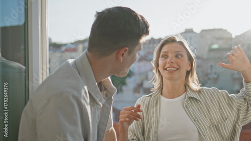 Obraz premium Cheerful girl speaking boyfriend on balcony closeup. Relaxed people enjoying