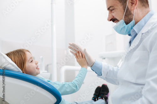 Obraz premium Cheerful great dentist giving his little patient a high five