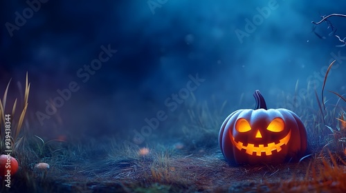 © Jane, Naklejka premium Cheerful Grinning Jack-o'-Lantern on Earthen Patch, Twinkling Starry Sky, Distant Hauntingly Beautiful Moon, Expansive Negative Space