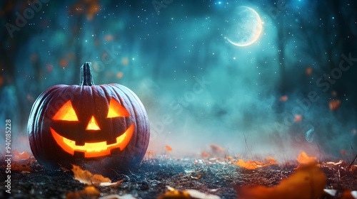 © Jane, Fototapeta premium Cheerful Grinning Jack-o'-Lantern on Earthen Patch, Twinkling Starry Sky, Distant Hauntingly Beautiful Moon, Expansive Negative Space