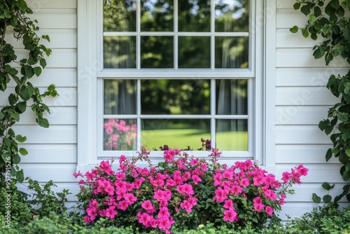 © SRITE KHATUN, Fototapeta premium Cheerful House Window with Blooming Pink Flowers