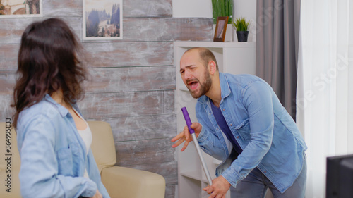 Fototapeta premium Cheerful husband and wife singing while cleaning the house.