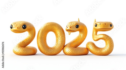 Fototapeta premium Cheerful 2025 in Gold with Cartoon Gold Snake on White Background
