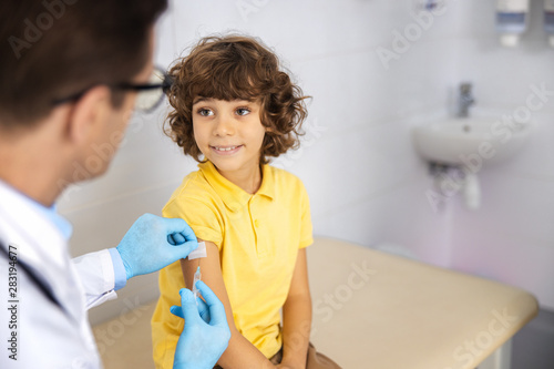 Fototapeta premium Cheerful kid visiting clinic for injection stock photo