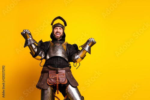 Naklejka premium Cheerful knight wearing armor on a vivid yellow background showing joyful...