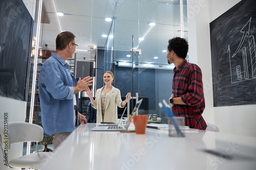 © Yakobchuk Olena, Obraz premium Cheerful lady saying hello to her colleagues