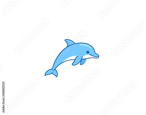 Obraz premium Cheerful light blue cartoon dolphin icon with a dark outline smiling in a dynamic leaping pose.