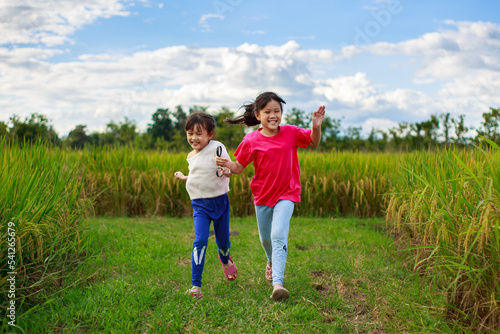 Obraz premium Cheerful little children play and outdoor running in the green rice field under blue sky. Concept for eco friendly in nature and happy childhood of school kids. Happiness and freedom.