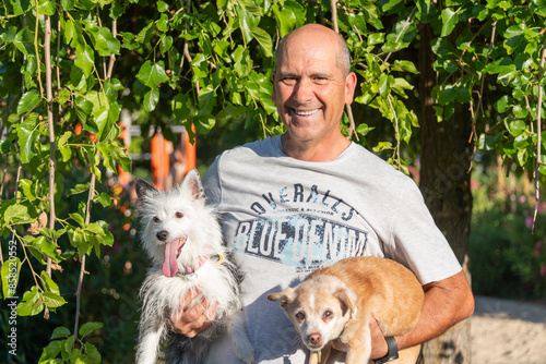 © Diego Schiochet, Obraz premium Cheerful man holding two small dogs, one with fluffy black and white fur and the other with light brown fur, in a sunlit garden.