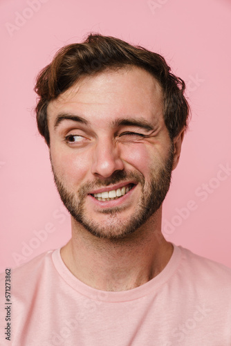 © Drobot Dean, Fototapeta premium Cheerful man winking and looking aside while posing isolated over pink wall