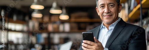 © Ilja, Fototapeta premium Cheerful Middle Aged Businessman Posing with Smartphone in Modern Office for Professional Portraits