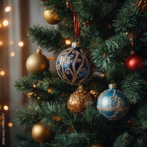 © Oleksandr, Fototapeta premium Cheerful ornaments enhance the beauty of the tree