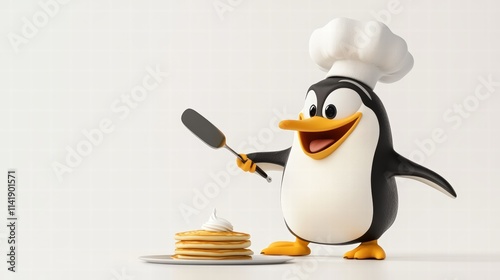 © KRCOKE, Obraz premium Cheerful Penguin Chef Preparing Pancakes with a Spatula