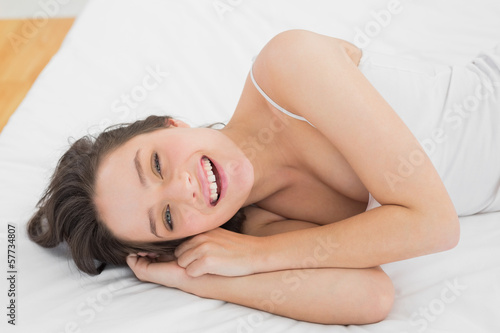Fototapeta premium Cheerful pretty young woman lying in bed