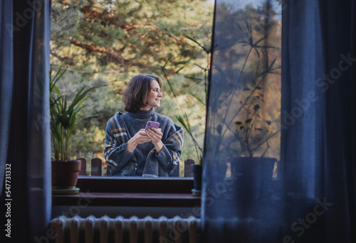 Naklejka premium Cheerful pretty young woman 30 years old standing on the terrace of a country house and using a smartphone, view from the room through the window