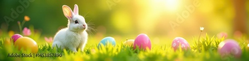 © flower, Obraz premium Cheerful rabbits amidst colorful eggs in a sun-drenched field , idyllic, spring