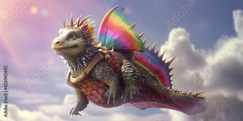 Obraz premium Cheerful rainbow dragon soaring above fluffy clouds with whimsical charm - AI generated