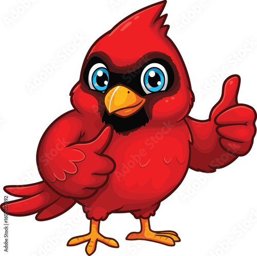 Fototapeta premium Cheerful red cartoon cardinal bird giving thumbs up, fun mascot character for...