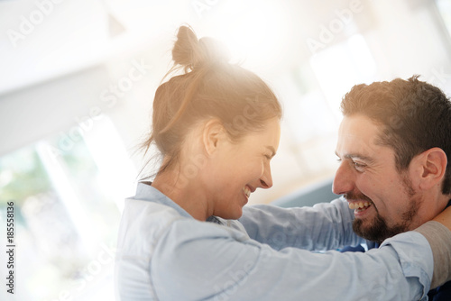 © goodluz, Obraz premium Cheerful romantic couple of lovers cuddling