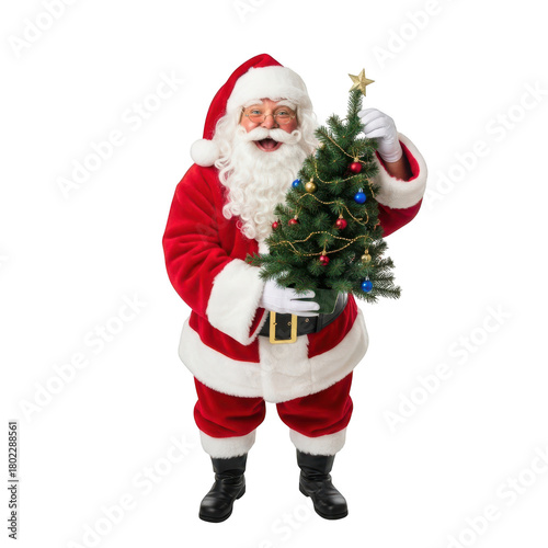 © MSTSHEWLI, Fototapeta premium Cheerful Santa Claus holding a decorated Christmas tree and smiling warmly