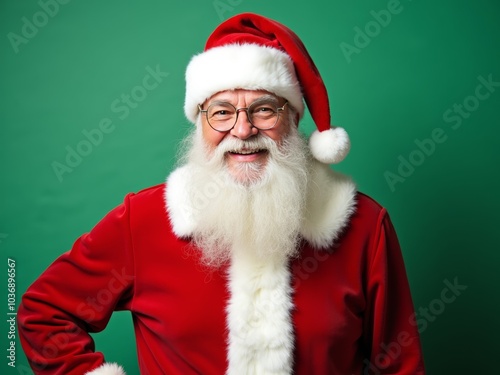 © useful pictures, Naklejka premium Cheerful Santa Claus stands against a green background, spreading holiday joy with a warm smile in this festive seasonal portrait