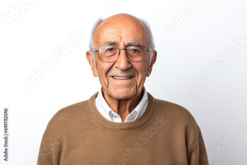 Obraz premium Cheerful senior man with glasses and beard smiling for the camera on white...