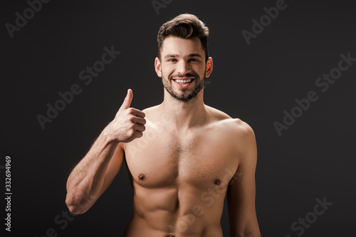 © LIGHTFIELD STUDIOS, Fototapeta premium cheerful sexy naked man showing thumb up isolated on black