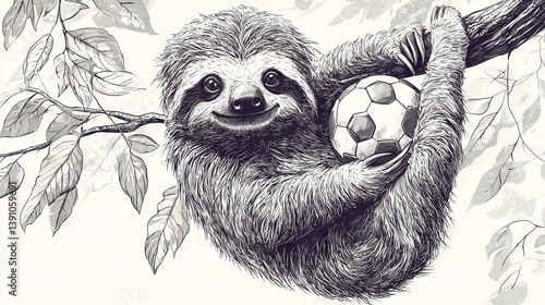 Fototapeta premium Cheerful Sloth Holding Soccer Ball in a Black and White Illustration
