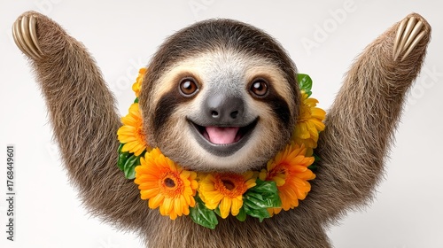 Naklejka premium Cheerful sloth wearing a vibrant flower necklace, raising its arms in a...