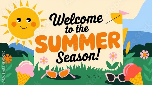 Naklejka premium "Cheerful Summer Season Sign Illustration with Sun, Flowers, Ice Cream, and...