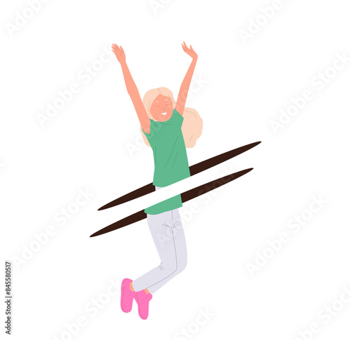 Fototapeta premium Cheerful teen girl cartoon character jumping through futuristic gate hole...