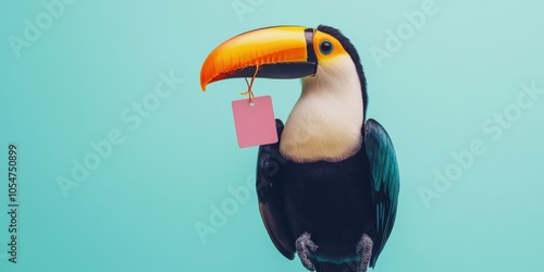© AiExpert, Naklejka premium Cheerful Toucan with Discount Tag on Pastel Blue Background