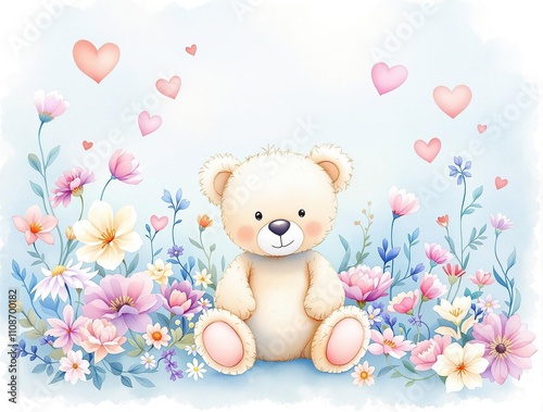 Obraz premium Cheerful watercolor pattern featuring teddy bear, flowers, and hearts in a...