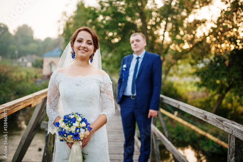© AS Photo Family, Naklejka premium Cheerful wedding couple on wooden bridge at sunset.