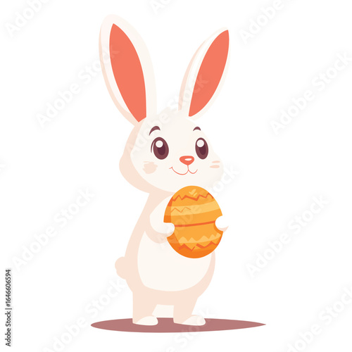 © Illahstd, Obraz premium Cheerful White Easter Bunny Holding Decorated Orange Egg